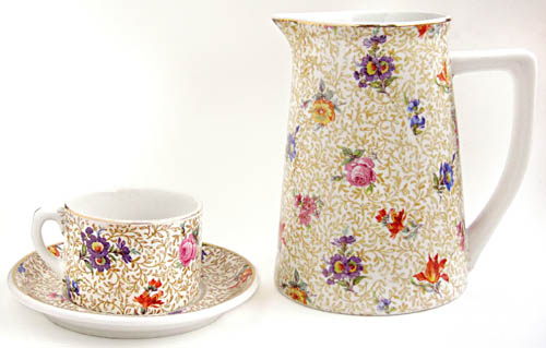| Jarro (1 litro) e xícara de chá, Porcelana Rio Branco, déc. 1950. |
